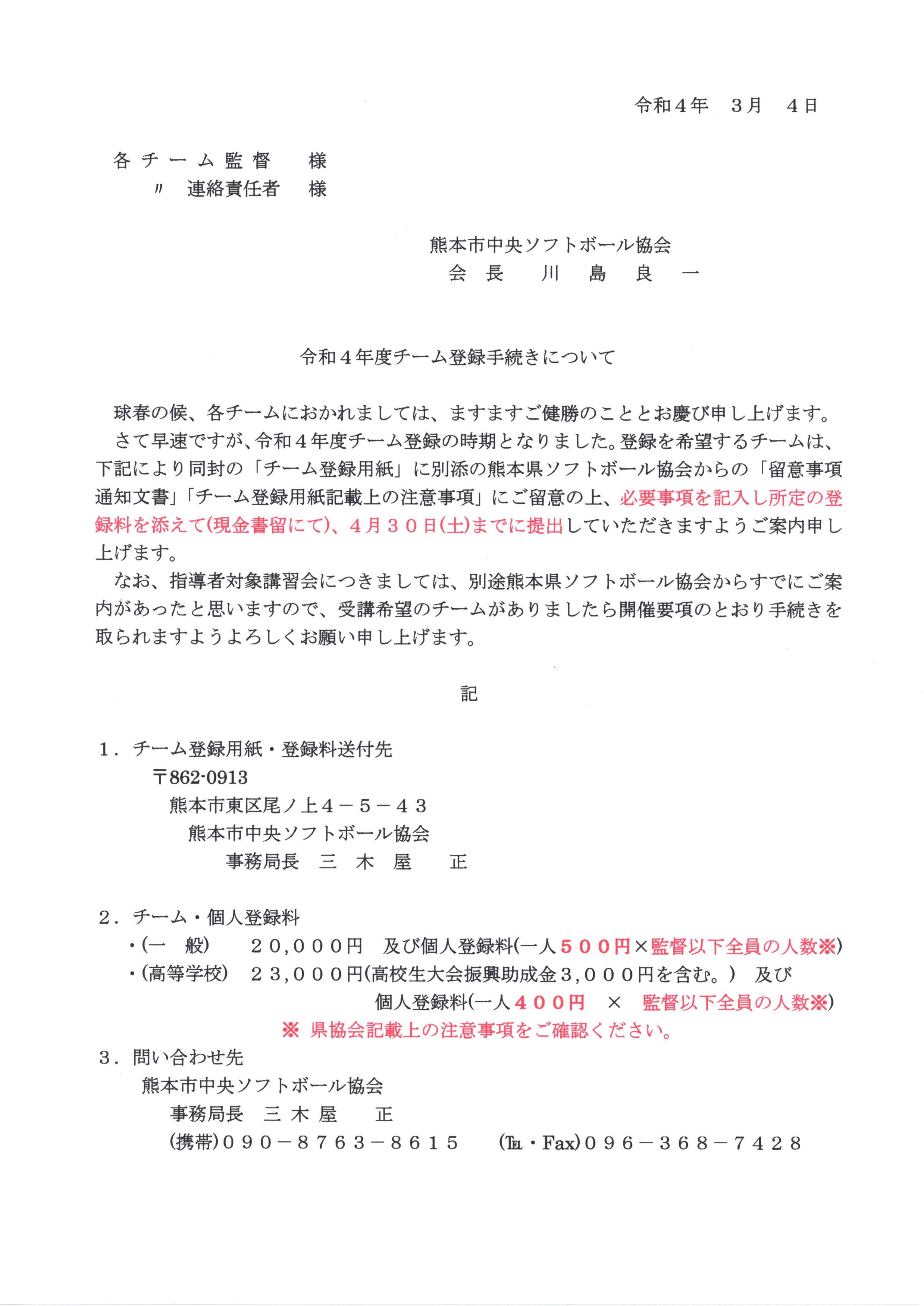 令和04年度 チーム登録手続きについてのお知らせ